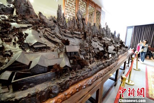 3月24日,用名贵珍稀木材小叶紫檀雕刻而成的巨型“清明上河图”亮相福建红木之乡仙游,吸人眼球。该雕刻作品长近10米,宽1.3米,标价超过亿元人民币。中新社发 王东明 摄