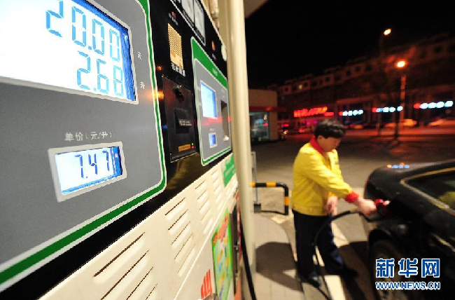 3月26日,安徽合肥市一家加油站的工作人员为机动车加油。 3月26日,国家发改委发出通知,根据近期国际市场油价变化情况,按照现行成品油价格形成机制,自2014年3月27日起,国内汽、柴油价格每吨分别降低135元和130元,测算到零售价格90号汽油和0号柴油(全国平均)每升分别降低0.1元和0.11元。这是今年以来我国成品油价格第三次下调。