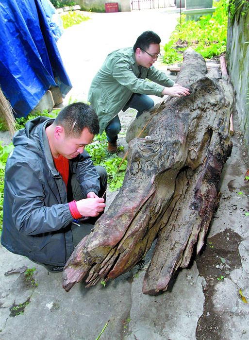 图为重庆市渝中区文管所,工作人员对这根乌木进行测量。罗伟 高科 摄 图片来源:重庆晨报