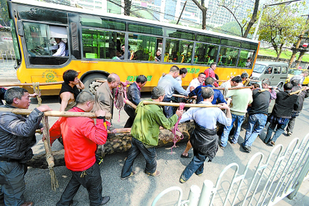 中午的日头正热人。20名力哥抬着重约3吨的乌木,额头上渗出细密的汗水,脸庞变得通红。乌木被捞起之后,南纪门长江边是起点,终点是解放东路渝中区文管所。虽然旅程不是很长,但力哥们一路上歇了好几次。据记者了解,从昨日(3月26日)上午10点多开始移动乌木,到力哥将乌木抬进文管所,已经是下午1点过了。
