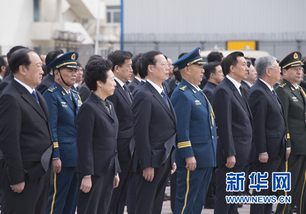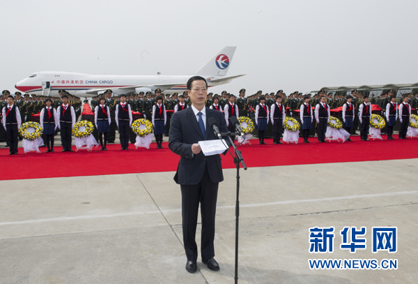 3月28日,中共中央政治局常委、国务院副总理张高丽在沈阳桃仙国际机场出席在韩中国人民志愿军烈士遗骸回国迎接仪式并讲话。新华社记者王晔 摄