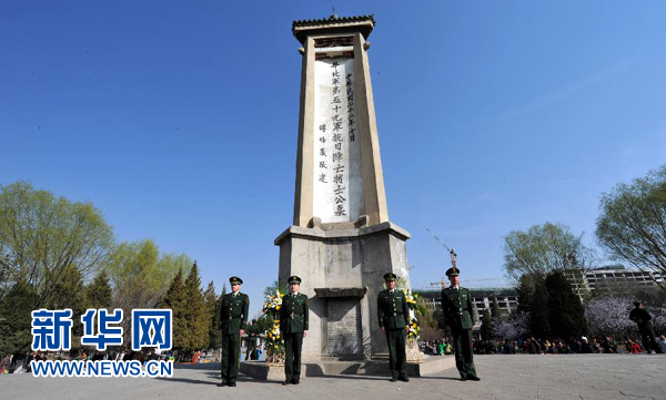 资料图:在清明节来临之际,内蒙古呼和浩特边防检查站近60名官兵来到位于呼和浩特市公主府公园的华北军第五十九军抗日阵亡将士公墓纪念碑,举行“忆史明志,忠勇报国”主题祭扫活动。这是祭扫活动现场。新华社记者阿斯钢4月1日摄