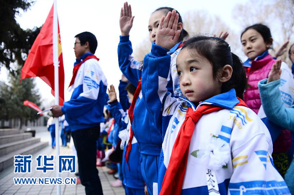 资料图:4月1日,西宁市玉井巷小学学生向中国工农红军西路军纪念碑行礼。在清明节来临之际,位于青海省西宁市的中国工农红军西路军纪念馆,开展各种形式的革命先烈墓祭扫活动和爱国主义教育活动。 新华社记者 张宏祥摄