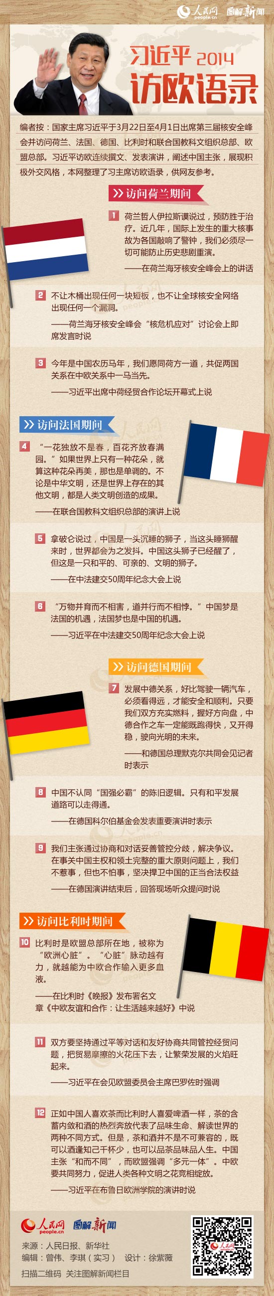 国家主席习近平于3月22日至4月1日出席第三届核安全峰会并访问荷兰、法国、德国、比利时和联合国教科文组织总部、欧盟总部。习近平访欧连续撰文、发表演讲,阐述中国主张,展现积极外交风格,本网整理了习主席访欧语录,供网友参考。