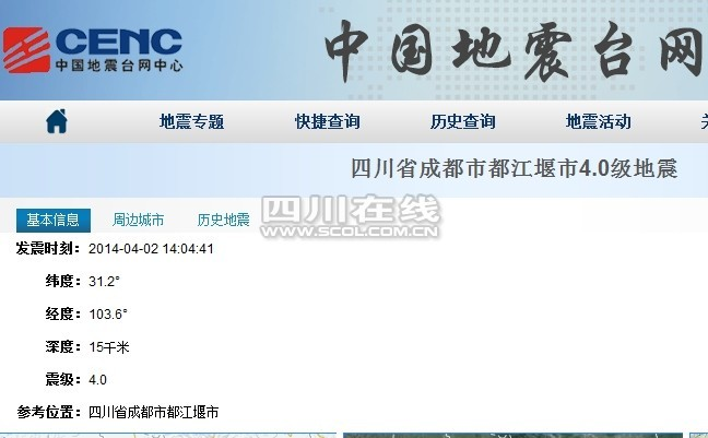 都江堰发生4.0级地震 成都市区有轻微震感