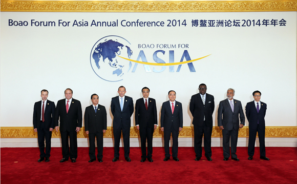 新华网北京4月10日电 据新华社“新华视点”微博报道,4月10日上午,国务院总理李克强出席博鳌亚洲论坛2014年年会并发表主旨演讲。开幕式前,李克强与出席论坛年会的外国领导人合影。