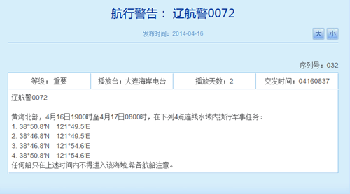 中新网4月16日电:据辽宁海事局网站消息,16日19时至17日8时,在黄海北部相关水域将执行军事任务,要求期间任何船只不得进入该海域。