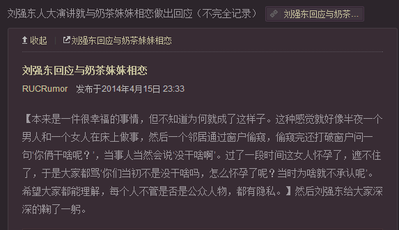 演讲结束后,有多个微博账号谈到了关于刘强东此次演讲的内容,其中微博账号“强风THU”的上传了演讲实录,在这篇实录中,刘强东回应与奶茶妹妹的恋情时说道,“本来是一件很幸福的事情,但不知道为何就成了这样子。这种感觉就好像半夜一个男人和一个女人在床上做事,然后一个邻居通过窗户偷窥,偷窥完还打破窗户问一句‘你俩干啥呢?’,当事人当然会说‘没干啥啊’。过了一段时间这女人怀孕了,遮不住了,于是大家都骂‘你们当初不是没干啥吗,怎么怀孕了呢?当时为啥就不承认呢’。希望大家都能理解,每个人不管是否是公众人物,都有隐私。”刘强东后来就对学生表示,他很看重个人隐私,感觉自己被消费了一把,还只能保持沉默,很无奈,在中国这个社会也只能这样了。以上内容,在微博账号“RUCrumor”、微信公共账号“经济跳蚤”等多个账号发布的内容中亦有类似纪录。