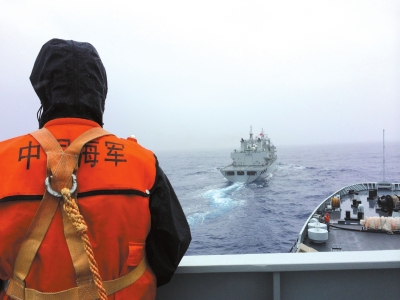 4月16日,中国海军千岛湖舰(中)向井冈山舰实施纵向液货补给。当天,已南下至新搜索区的中方舰船继续向南微调,在南纬27-30度、东经92-95度、面积6700平方海里的区域内联合搜寻,目前暂无发现。澳大利亚方面昨天称,“蓝鳍金枪鱼”自主水下航行器当天上午因技术调整上浮后,已被重新部署,继续展开水下搜索任务。(新华社发)