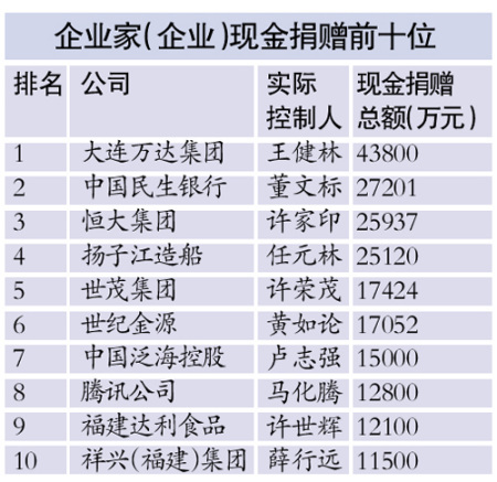 2014年捐赠过亿元的企业家有12位,他们的捐赠金额占总额的51.4%,王健林首次成为福布斯2013年中国富豪榜和2014年中国慈善榜的双料之“首”。