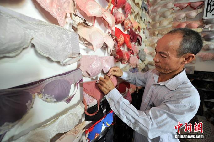 4月21日,海南省三亚市崖城镇的陈清祖花费20年时间收集5000余件文胸,在一间栋不起眼小房间的墙壁上、天花板上挂满了各式各样的女性文胸,数量多达5000余件,而这些令人目不暇接的“藏品”来自全国30多所高校的女生。据陈清祖介绍,他的梦想是将来打造一间文胸收藏馆,通过展示内衣,提高全社会对女性乳房健康的关注度。图为陈清祖展示他的“特别藏品”。中新社发 骆云飞 摄