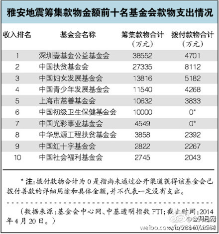 “四月网”在微博上写道,“我们的捐款去哪了?截止到2014年4月20日8点02分,全国219家基金会参与雅安地震募捐,接收社会捐款16.96亿元,目前已支出款物6.45亿元,占总收入的38%。壹基金一家独大收了近4个亿的捐款,目前拨付4千多万,仅占9%。”并公布了目前各个基金会款物支出情况的数据表。