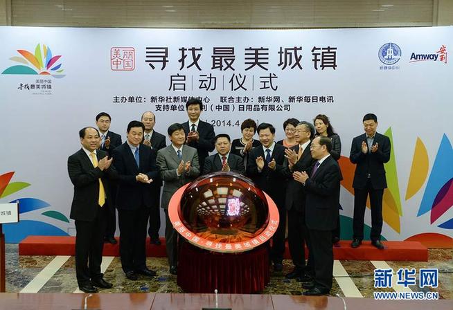 4月23日,国务院副秘书长王仲伟(前排中),新华社党组成员、副总编辑慎海雄(前排右三),新华社副秘书长姚光(前排左三),安利(中国)日用品有限公司总裁黄德荫(前排右二)等一起启动“美丽中国·寻找最美城镇”大型新媒体报道活动。当日,新华社“美丽中国·寻找最美城镇”大型新媒体报道活动在北京启动。活动将通过实地调研采访与主题论坛相结合的方式,展示我国近年来城镇化进程中的最美风景线。这项大型新媒体报道活动,由新华社新媒体中心发起并主办,新华网、新华每日电讯联合主办,安利(中国)日用品有限公司全程支持。活动依托新华社全媒体优势,借助网络、微博、微信、客户端等新媒体传播方式,通过开展“美丽中国·随手拍家乡”等线上主题活动,邀请全国网民共同参与寻找、发现中国城镇之美。新华社发(李方宇 摄)
