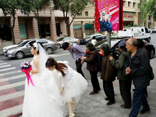 下午2点,四川新闻网记者来到现场时,并没有遇到结婚的新人,也未看到来要钱的老年人。不过据附近的环卫工人介绍,网友反映的事情确实存在几个星期了,每次有新人在斑马线拍照时,一群老头老太婆就会跑出来要钱,“少的话几个人,多的话十几个,如果不给,他们就冲上去抢红包。”
