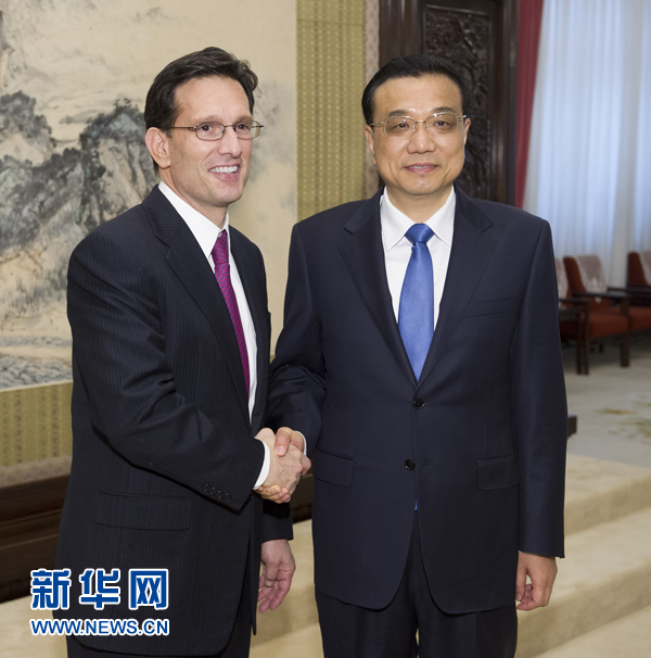 4月24日,国务院总理李克强在北京中南海紫光阁会见由美国国会众议院多数党领袖坎托率领的议员代表团。 新华社记者 黄敬文 摄