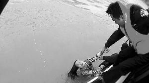 巡逻艇靠近落水女子时,这名女子头部时隐时现,极力挣扎,靠着微弱的意识发出阵阵求救声。民警耿兵伸出救援杆,引导轻生女子抓杆露头,保持呼吸,同时控制住她的身体,一点点拖向船舷右侧,将她救出水面。