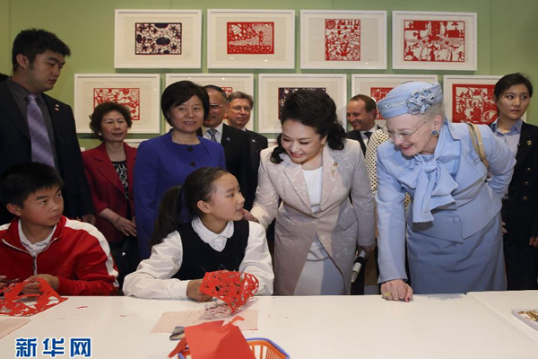4月25日,丹麦女王玛格丽特二世在中国国家主席习近平夫人彭丽媛陪同下参观“安徒生童话在中国”展览。这是彭丽媛和玛格丽特二世来到两国孩子们当中,为孩子们朗读安徒生童话《丑小鸭》选段。(新华社记者 兰红光 摄)