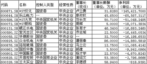 此外,从企业盈利角度看,有13家企业的董事长在企业处于亏损状态下依然领有薪酬。如众合机电去年亏损1.48亿,其董事长年薪为96万元,其年薪在亏损央企中拔得头筹。