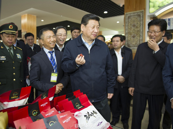 新华网北京4月30日电 据新华社“新华视点”微博报道,习近平28日下午来到位于乌鲁木齐的新疆果业集团有限公司。展厅内干果产品琳琅满目,总书记边听介绍边应邀品尝,称赞树上干杏“别有风味”、若羌枣“味道好”。拿起袋装葡萄干,问:“没用化肥吧?”看到一包和田大枣标价190元,他又马上问老百姓能得到多少收益。