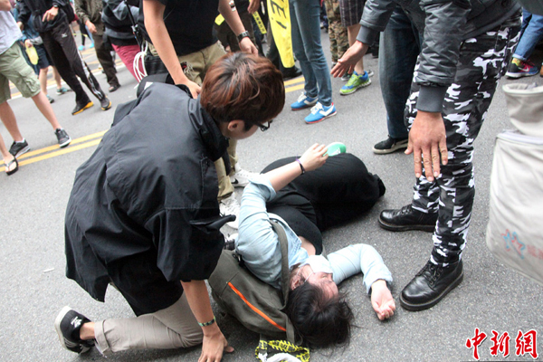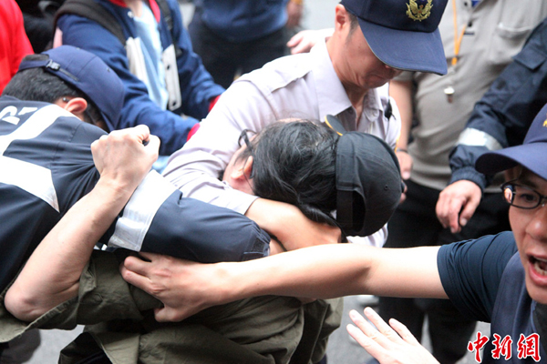 4月29日,台湾“反核”团体等号召群众包围“立法院”各出口,围堵“立委”座车,只让进,不让出,诉求要他们回去开会,赶快决定废除“核四”。多名“立委”座车外出被挡,警方为使“立委”座车能够出行,排除被堵障碍,与“反核”群众发生多波激烈肢体冲突,场面数度混乱,有群众当场昏倒。(中新社发 陈立宇 摄)