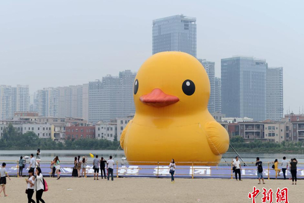 5月4日,许多民众在厦门海沧湖参观“大黄鸭”。先后游历11个国家地区17个城市的大黄鸭4月中旬开始“造访”厦门,五一期间,“大黄鸭效应”为海沧商家带来超常人气,客流量比去年同期大幅增长。(中新社发 刘可耕 摄)