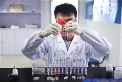 4月28日,北京智云达科技有限公司消费者体验中心,实验中8种铝超标油条样品液呈现蓝色,合格的2种油条样品液为浅褐色。
