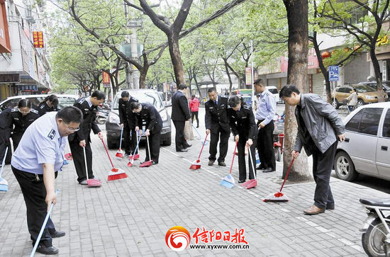 8日,一张信阳城管打扫街道的照片引发网友热议,照片中多名执法人员手持扫帚,围在不到20平米的人行道上打扫。网友们认为照片摆拍痕迹明显,质疑执法人员在作秀。