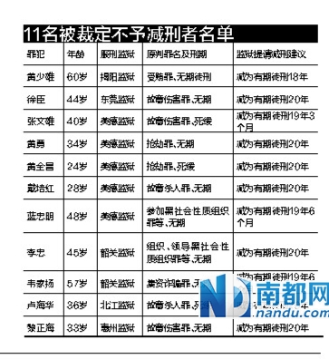 南都讯 记者任先博 今年年年初,广东省高级人民法院官方网站首次公示733件拟减刑假释案件。近日,该网站发布《减刑假释案件裁定结果公示》,其中,省委统战部原副部长黄少雄等11人被裁定“不予减刑”。