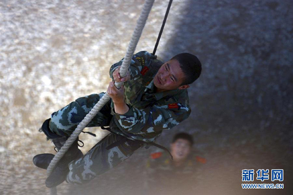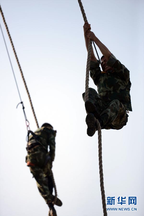 5月12日,特战队员在进行特种攀登课目训练。蜘蛛侠是漫画中的英雄角色,其可以利用自己放射出的蜘蛛丝飞檐走壁,与黑暗势力进行不懈斗争,被人们视为正义的象征。在武警江苏省总队一支队,也有这样一群以保护人民安全为己任、身着军绿警服的“蜘蛛侠”。