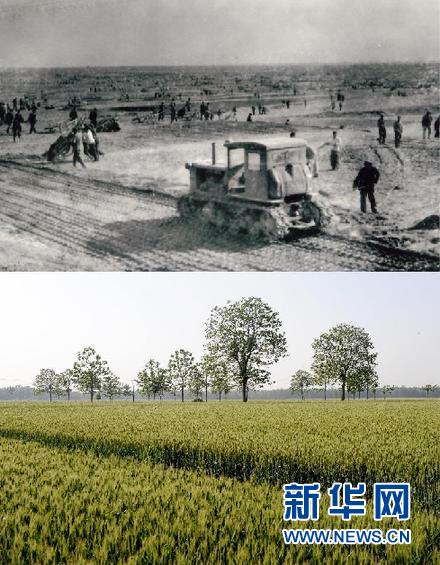 这组拼版照片显示了二十世纪六十年代兰考改造盐碱地的情形(上图,资料照片);下图为5月5日拍摄的兰考县固阳镇的一片麦田(新华社记者 朱祥 摄)。