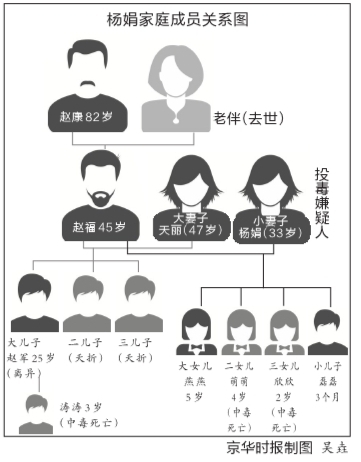 3月25日,一桩致3名幼童死亡的投毒案让这个小村庄成为焦点。经过40天调查,近日,该起案件的嫌疑人被警方刑拘,凶手竟然是其中两名遇害女童的亲生母亲杨娟。警方初步调查得知,村民赵福多年来一直过着双妻生活,家庭人员关系复杂。小妻子杨娟因家庭矛盾将家中3个小孩毒害,包括自己亲生的两个女儿及赵福大妻子3岁的孙子。