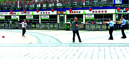 手持木棒的单连波(右)与歹徒对峙(资料图)
