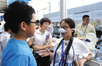 昨日,在北京农业展览馆新馆开幕的北京科技周上,防雾霾“鼻罩”引起了众多参观者的兴趣。
