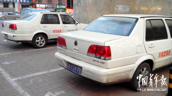 5月17日19时许,太原海世界海鲜广场楼下,4辆印有“中国大地保险查勘定损车”标志的白车停泊着,车牌号分别为:晋A AE608、晋A AF957、晋A NF643和晋A Y3979。实习生崔建伟摄