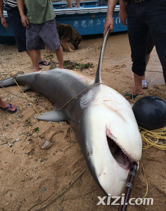 叶先生说,鲨鱼在大亚湾海域常见,渔民潜水时会看到。尤其是每年的4月到8月水温渐暖期间,鲨鱼会靠岸寻觅食物,到了冬天,它们又游到大海里去了。“大都是对人没有伤害的,而且个头较小,一般几十斤、一两百斤。”他说,但虎鲨会吃人,也会伤害其他动物,在大亚湾海域很少见,至少有二三十年没发现过了,“为了防止它伤人,我们才将它捕获。” 图为被捕获的鲨鱼。