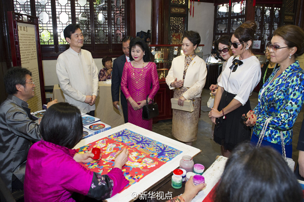 彭丽媛和贵宾们在豫园静观的展台前驻足停留,听取介绍。彭丽媛不时拿起面塑、扎染布等传统手工艺品给贵宾们欣赏。“农民画用的是什么颜料?”“木版水印和版画有什么区别?”“扎染布会褪色吗?”……大家纷纷提问,同非物质文化遗产传承人亲切交流。