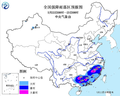 预计,22日08时-23日08时,江南中南部、华南大部等地有大到暴雨,其中,广西北部和东部、广东西部、江西中部偏东地区、福建北部等地的部分地区有大暴雨(100~150毫米)。上述地区局地将伴有雷暴大风等强对流天气。