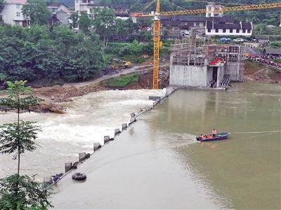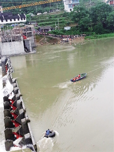双岔河一端属重庆境内的泄洪阀,水流如直泻的瀑布;而湖南境内的另一端,因洪水流速快,救援人员无法到达,远远望去犹如一片汪洋。