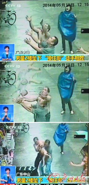 本月18日中午,在中山市小榄镇潮南路一栋房子的2楼,一名幼童在二楼爬在没有防护网的窗户上大声喊妈妈,眼见小孩即将掉下来,一名身穿灰色衣服的男子李显文从屋对面冲到楼下,举着双手在楼下调整自身的姿势和位置,准备随时接住该小孩。随后,又跑来两名女子,分别拿来一张沙发凳和一叠纸箱放在小孩可能坠下的垂直地面,接着又有一名赤膊男子也跑过来,举着双手严阵以待。12时14分,小孩不慎直接从二楼掉了下来,李显文顺着小孩掉下来的惯性往下一接,稳稳地将幼童抱在怀里,万幸的是双方均无受伤。而李显文也因此被称为“接住哥”。