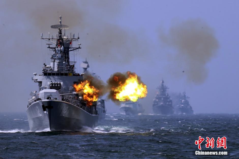 昨天下午1时许,东海某海域突然间炮声四起,中俄联合编队6艘舰艇进行了对“舰”射击、火箭深弹攻“潜”、对空实射等演练。