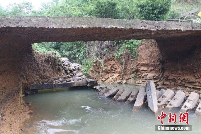 5月26日,江西省宜春市袁州区西村镇圳江村一段长约10米的水泥路被山洪冲毁路基,只剩路面悬在约3米高的空中未垮塌,被路人称为“路坚强”。邹海斌 摄