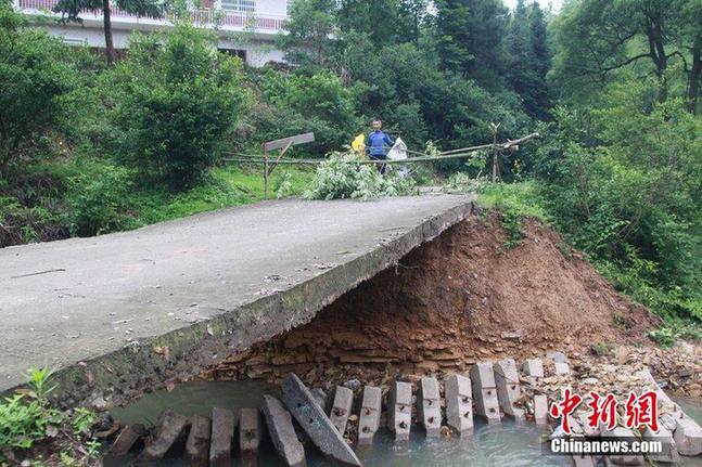 5月26日,江西省宜春市袁州区西村镇圳江村一段长约10米的水泥路被山洪冲毁路基,只剩路面悬在约3米高的空中未垮塌,被路人称为“路坚强”。邹海斌 摄