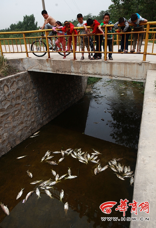 西安临潼区秦陵街办。几名放学路过鱼塘的孩子趴在桥边看热闹,有的孩子捏住鼻子躲避死鱼发出的臭味。不知何原因,吴师傅鱼塘的鱼大批死亡,吴师傅怀疑与上游的排污有关。本报记者 王警 摄