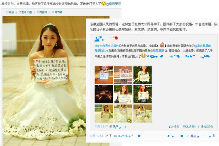 今天凌晨,西安外国语大学女生 @ 来自星星的任舒悦Sue 发微博向男友羞涩告白、大胆求婚。这一大胆行为得到了许多认得祝福,其男友 @ 橙若星辰也在微博与其互动:“无论大家吐槽还是祝福,我们都一定会很幸福。感谢大家的祝福,这份生日礼物太非同寻常了。因为有了大家的祝福,才会更幸福。以后的日子我会更用心的对她好。我爱你,亲爱的。等你毕业我就娶你!”