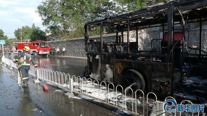 李先生称已有三辆消防车赶到现场,数名消防员正在对公交车进行喷水作业。目前车辆明火已经被扑面,公交车已烧得只剩下车架。警察询问他时,当时车上有三,四十人,司机试图灭火,车上也有灭火器,但没有成功,乘客已经成功疏散