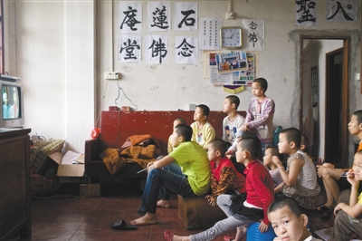 早中晚有例行的三次念经,稍大一些的孩子除了要做家务活,还要照顾更小的孩子。其余大部分时间,孩子们都在看书、练字、画画,复习这一周所学的小学课程。偶尔孩子们会聚集在一起,看《济公》的碟片,沉浸在电视带给他们的快乐之中。
