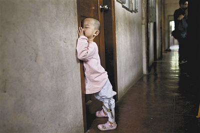 5月22日,5岁的释如童靠着房门。他患有先天性马蹄内翻足,一年前“借孤事件”后,才有机会前往广州医治。现如今,如童能勉强支撑着墙面行走。