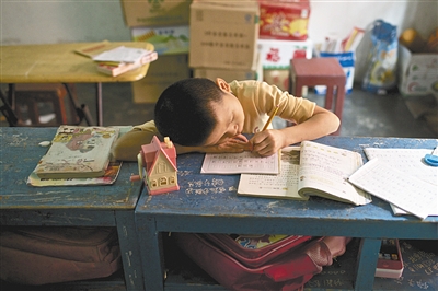 5月26日,一名孩子在学习功课。每周一上午孩子们都在寺庙殿堂边上一个20多平米的小房间里学习小学课程。