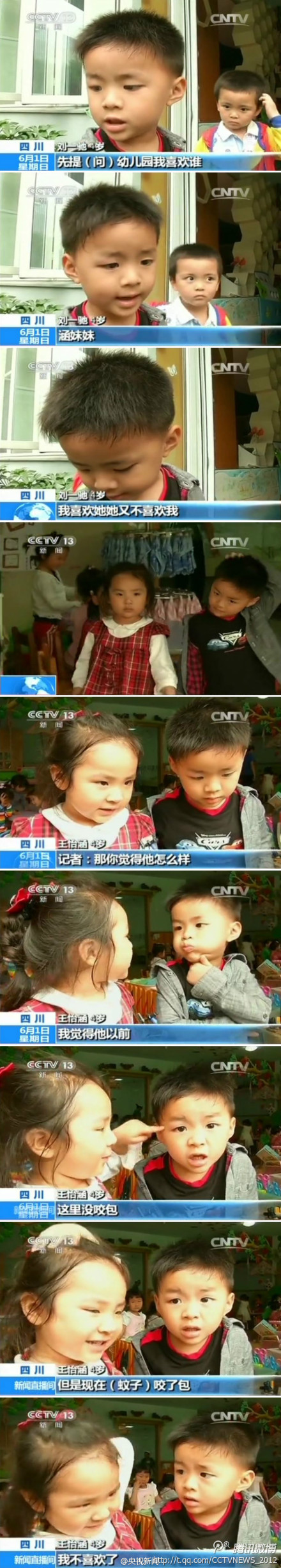 六一儿童节,央视播出特别节目《童言无忌》,一名4岁的小男孩主动要求记者问自己在幼儿园喜欢谁,结果小男孩叫来了喜欢的小女孩,人家却说:“他现在被蚊子咬了包,我不喜欢了…”