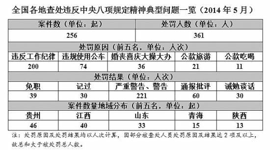 今年以来,中纪委加大了对违反“八项规定”情况的通报力度。中国青年报记者对上月通报情况进行了统计梳理发现,5月,中央纪委监察部网站共通报全国各地违反“八项规定”典型案例256起,涵盖了27个省(区、市)新疆生产建设兵团和中国移动公司,点名曝光361人。问题包括违反工作纪律、违规使用公车、公款旅游、婚丧喜庆大操大办、公款吃喝等。